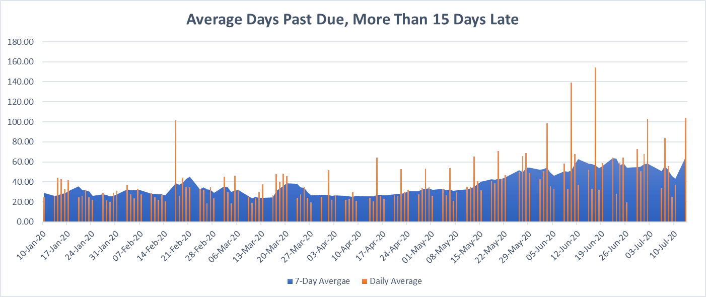 However, above we are looking only at late payments, which are payments that came in 15 days or more beyond terms, we see a very different story. In this situation we see number remaining fairly level until mid-May, at which point they start to grow. Looking at 7-day averages, we actually see several peaks in this graph. The first occurred on June 12th at 63 days beyond terms, the second occurred on June 22nd at 64 days beyond terms, and then just two days ago on July 13th, at 65 days beyond terms. On average, payments that came in late in 2020, were paid 35 days beyond terms.